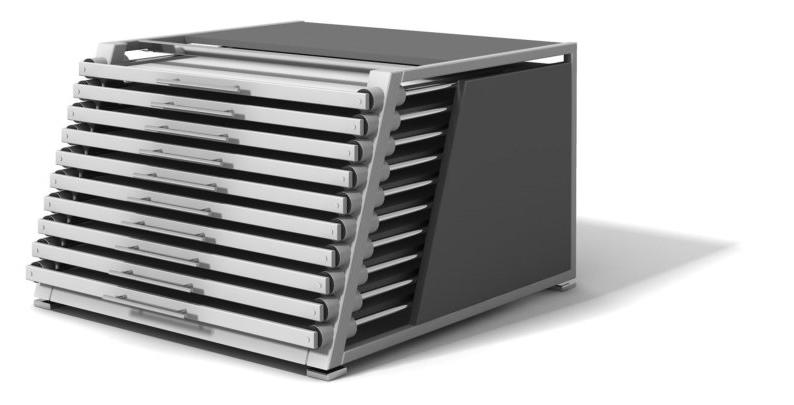 TECHNISCHE DATEN Breite / Tiefe / Höhe - 1100 x 1200 x 750 mm ausgezogen - 1900 mm Auszüge - 10 Metallrahmen 925 x 925 mm Tafelformat - 10 Mustertafeln 920 x 920 mm Führungsrohr - Edelstahl, 16-fach kugelgelagert Belastung - PREMIUM - max. 60 kg Belastung - SOLID - max. 100 kg (*) Ablageplatte - Spanplatte, Dekor, beschichtet Seitenplatte - Spanplatte, Dekor, beschichtet Rückwand - Spanplatte, Dekor, beschichtet (*) Farbgestaltung - siehe Kundendienst / Farben und Dekore (*) - Sonderausstattung gegen Aufpreis