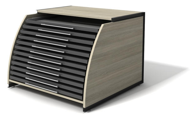TECHNISCHE DATEN Breite / Tiefe / Höhe - 1340 x 1350 x 1000 mm ausgezogen - 2100 mm / 2300 mm Auszüge - 12 Metallrahmen 1215 x 925 mm Tafelformat - 12 Mustertafeln 1210 x 920 mm Führung - Teilauszug / Rollenführung Belastung - COMPACT - max. 40 kg Führung - Vollauszug / Schwerlastauszug Belastung - SOLID - max. 100 kg Ablageplatte - Spanplatte, Dekor, beschichtet Seitenplatte - Spanplatte, Dekor, beschichtet Rückwand - Spanplatte, Dekor, beschichtet (*) Farbgestaltung - siehe Kundendienst / Dekore (*) - Sonderausstattung gegen Aufpreis